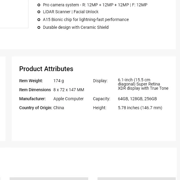 In the form of attributes like Shape, Color, Technical Information, Functions, Features, Dimensions, Weight etc